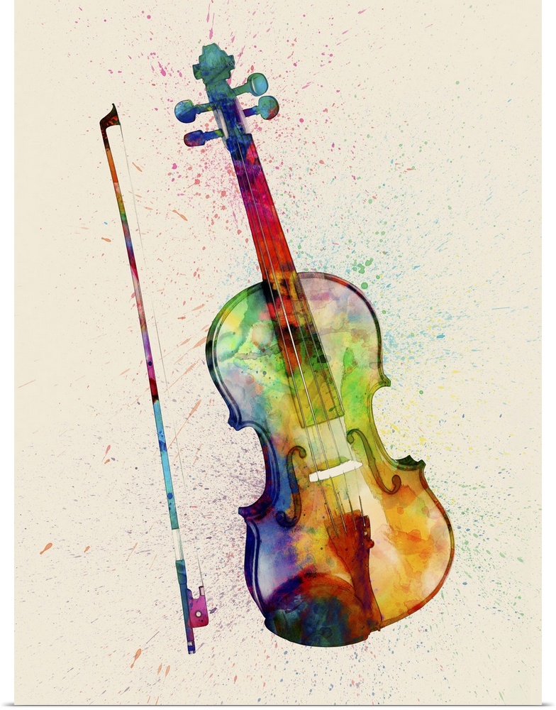 <p>Contemporary artwork of a violin with bright colorful watercolor paint splatter all over it.</p>