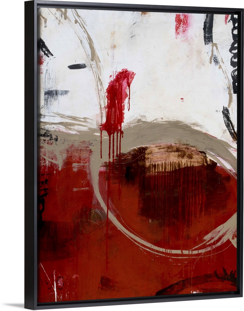 <p>A heavily red, contemporary abstract painting which focuses on dark tones of black, tan, and grey brushstrokes spread throughout.</p>