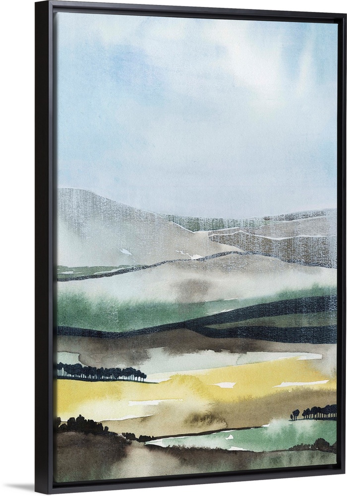 <p>Contemporary watercolor painting of a landscape made up of multi-colored layers.</p>