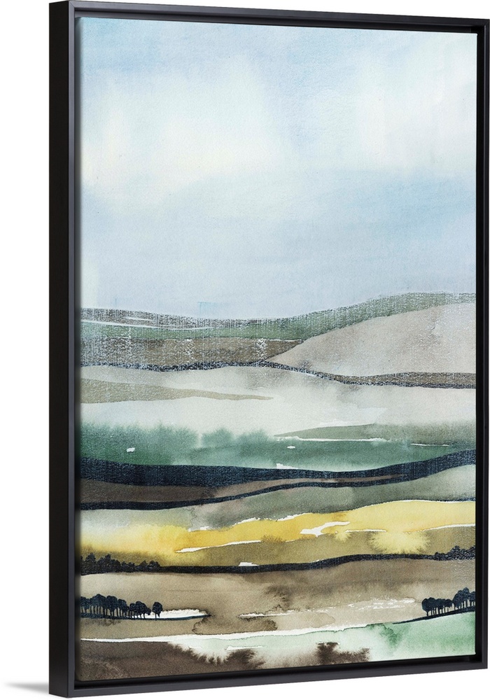 <p>Contemporary watercolor painting of a landscape made up of multi-colored layers.</p>