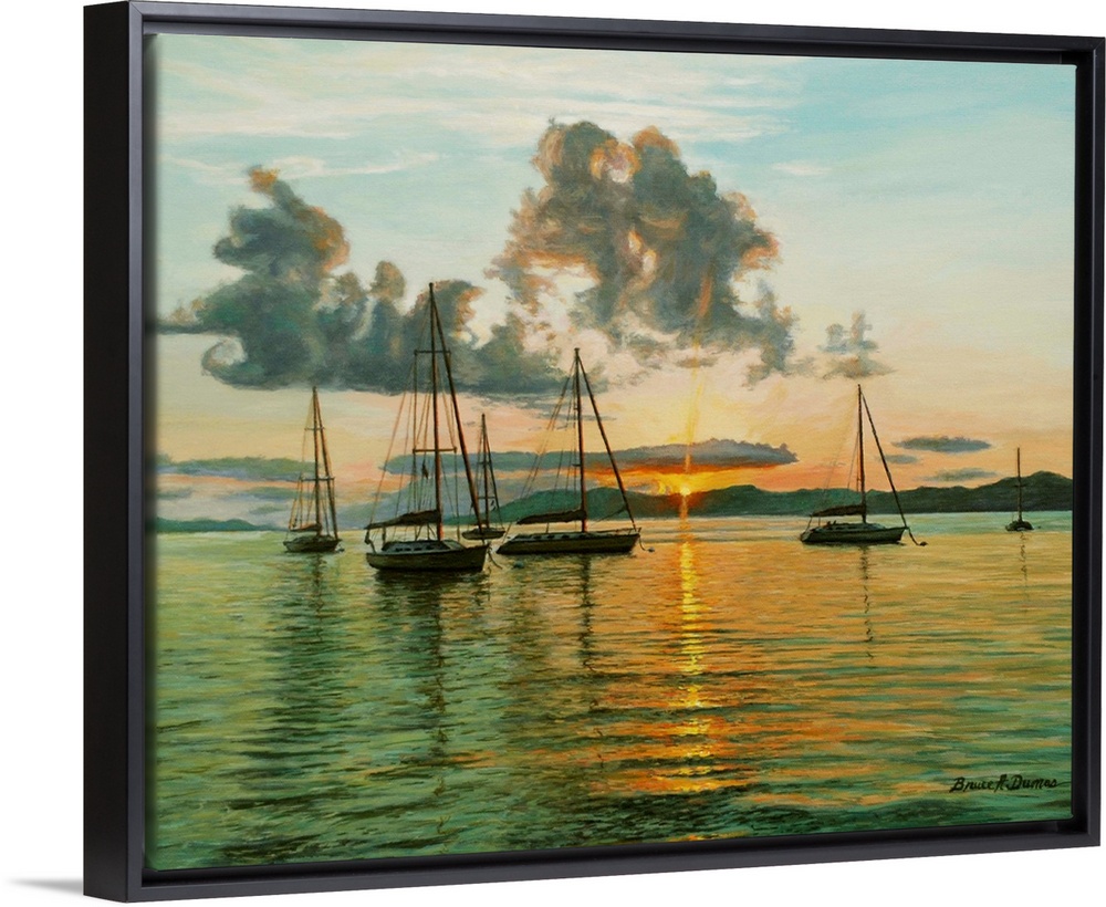 <p>Contemporary artwork of a cove with sailboats moored with islands in the background.</p>
