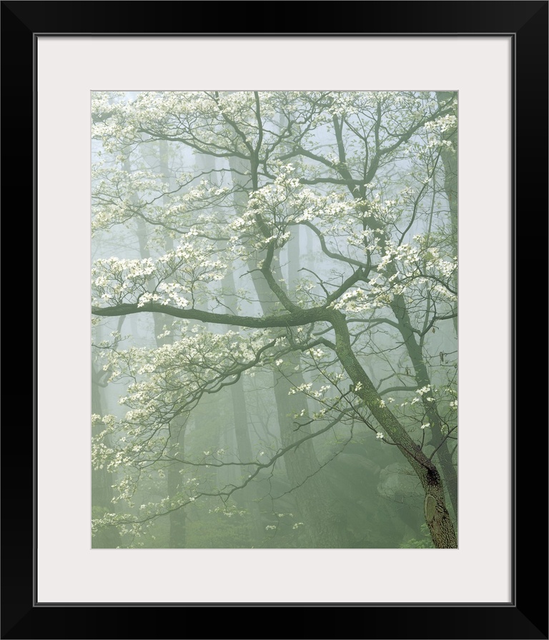 <p>USA, Virginia, Shenandoah National Park, Flowering Dogwood in foggy forest.</p>