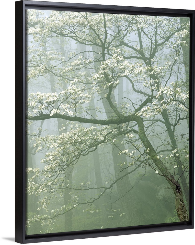 <p>USA, Virginia, Shenandoah National Park, Flowering Dogwood in foggy forest.</p>