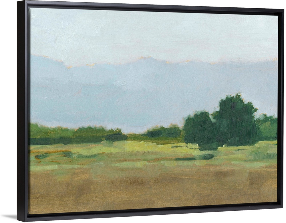 <p>Contemporary landscape painting in green and brown with a mountain range in the distance.</p>