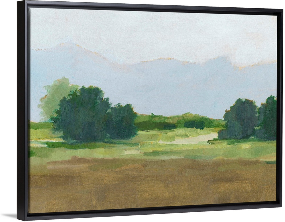 <p>Contemporary landscape painting in green and brown with a mountain range in the distance.</p>
