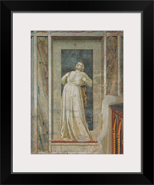<p>Allegory of Vice and Virtue Wrath, by Giotto, 1306 about, 14th Century, monochrome fresco, cm 120 x 55 - Italy, Veneto, Padua, Scrovegni Chapel. All. Woman dresses garments breast neckline neck bosom wrath desperation long hair panel gray light blue blue.</p>
