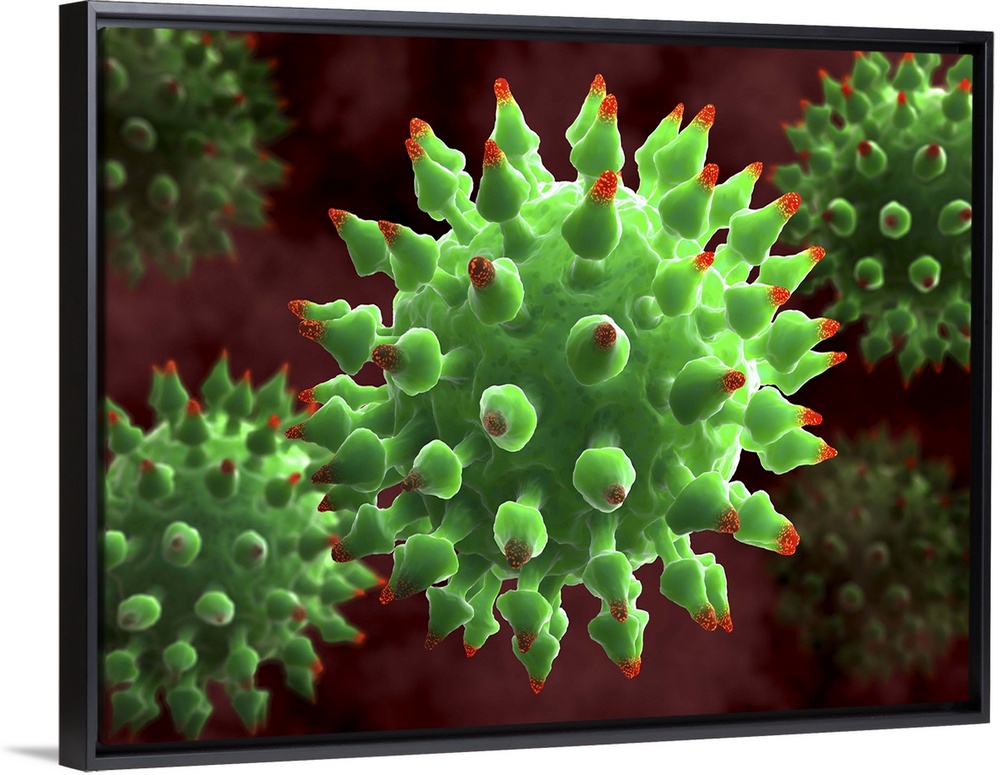 <p>Virus particles, computer artwork. The spikes (red-tipped) on the virus particles are surface proteins that help them to attach to cell membranes. Once attached, the virus particles release genetic material into the cell (not seen). This travels to the cell nucleus where it combines with the cell's genetic material. The cell then reads the genetic instructions and the cell's biochemical mechanisms build new virus particles. These new virus particles erupt from the cell, killing it. The viral infection spreads as the cycle repeats.</p>