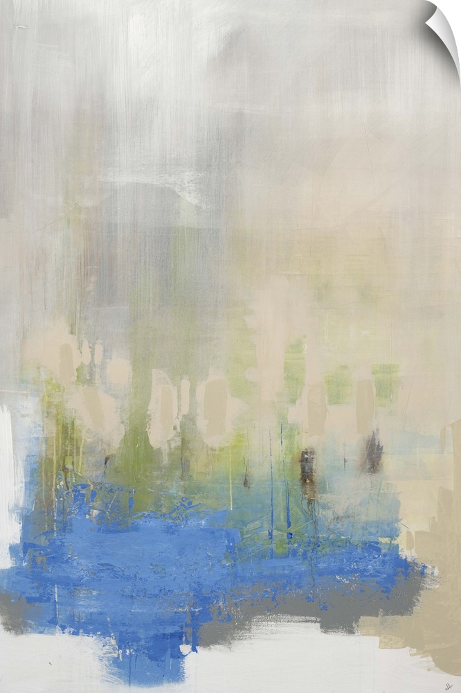 <p>Abstract painting of large blue object that fades into a thick fog above it, with vertical streaks and unrecognizable objects in the background.</p>