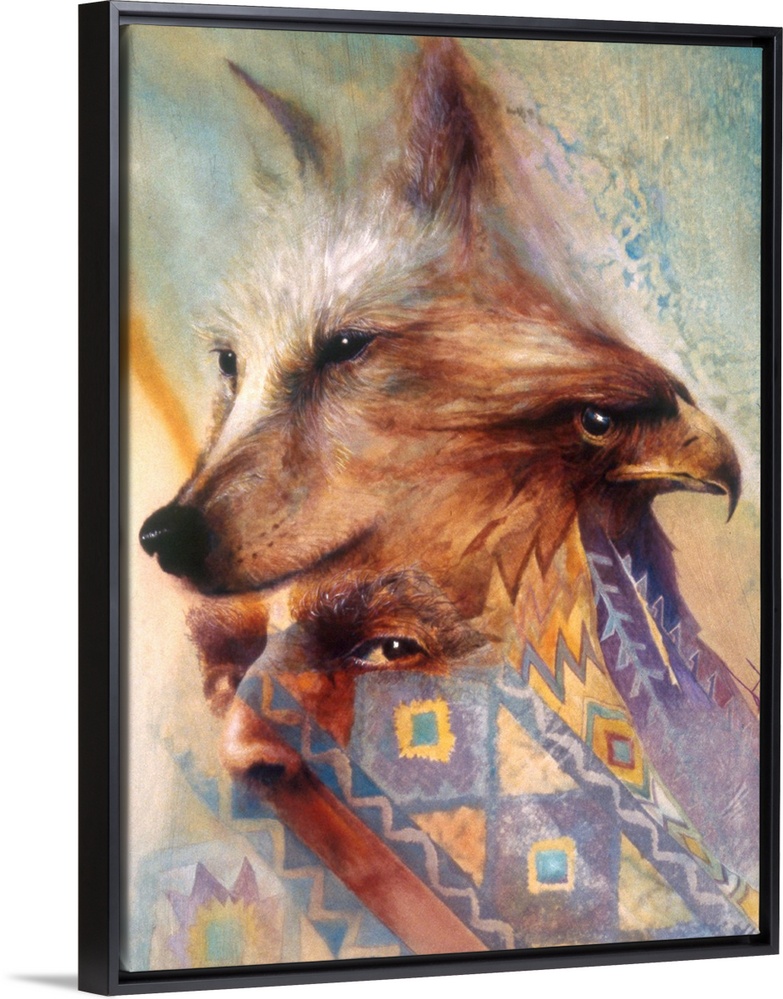 <p>A contemporary painting of a mans eyes surrounded by a wolf and eagle's head at the top and Native American patterns at the bottom.</p>