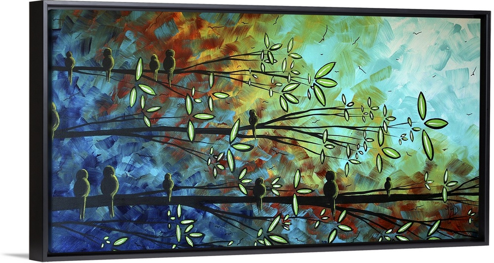 <p>Painting of several bird silhouettes and branches on a bright brushstroke background.</p>