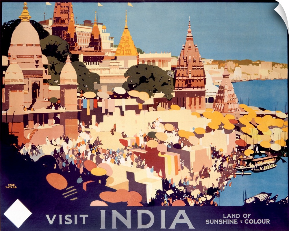 <p>Travel advertisement for India, the Land of Sunshine and Color, featuring the city of Varanasi.</p>