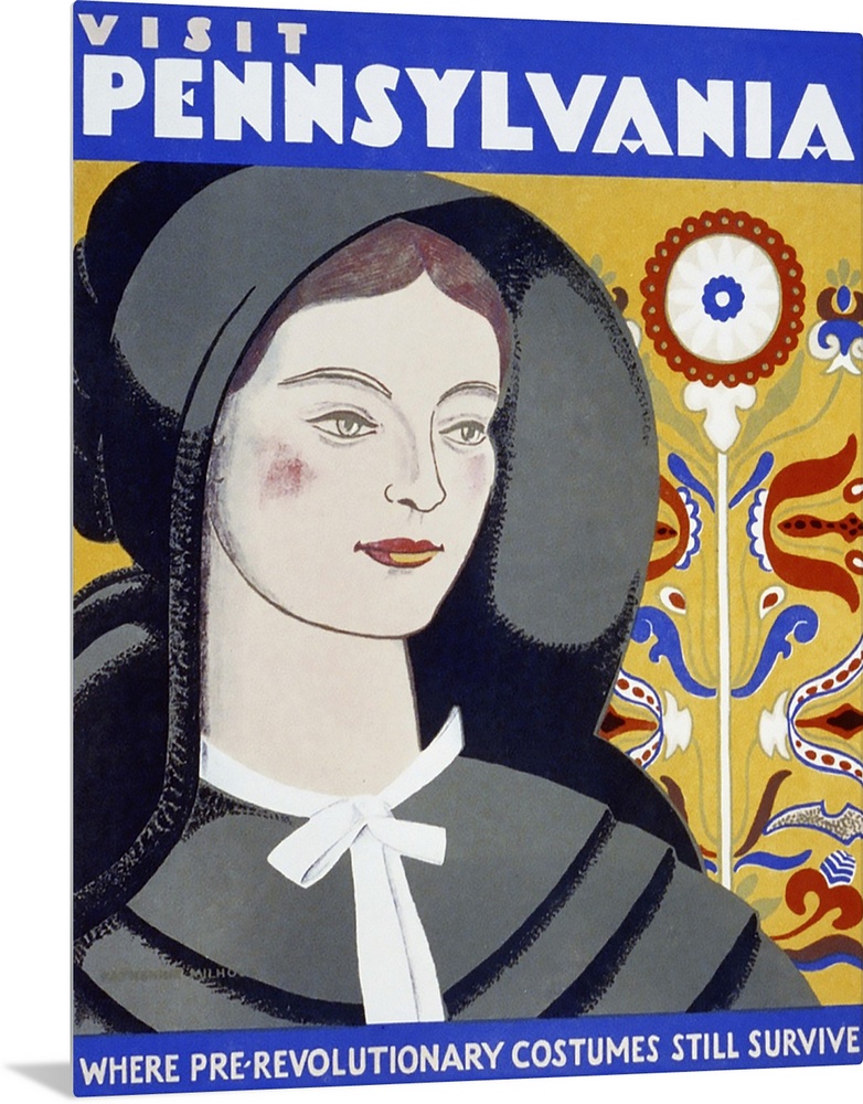<p>Visit Pennsylvania, where pre-revolutionary costumes still survive. Poster promoting Pennsylvania, showing head-and-shoulders portrait of a woman in eighteenth-century costume against a background of fraktur. Library of Congress, Prints and Photographs Division, WPA Poster Collection.</p>