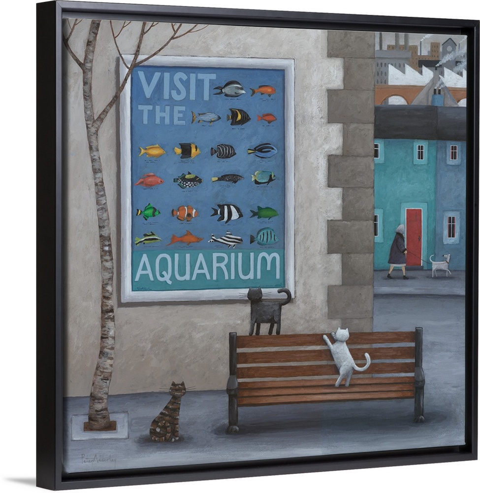 <p>Contemporary painting of a cats on a city sidewalk looking at an aquarium advertisement with images of fish on it.</p>