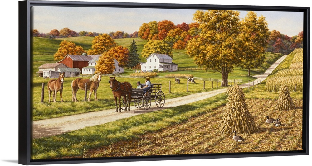 <p>A country fall scene with a horse and buggy going down a dirt road with a couple horses and a couple cows, on the other side of the road is a corn field with geese in it.</p>