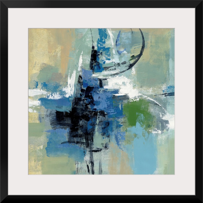 <p>Square abstract painting with cool tones and layers of brushstrokes becoming dense in the center and spreading out towards the edges.</p>