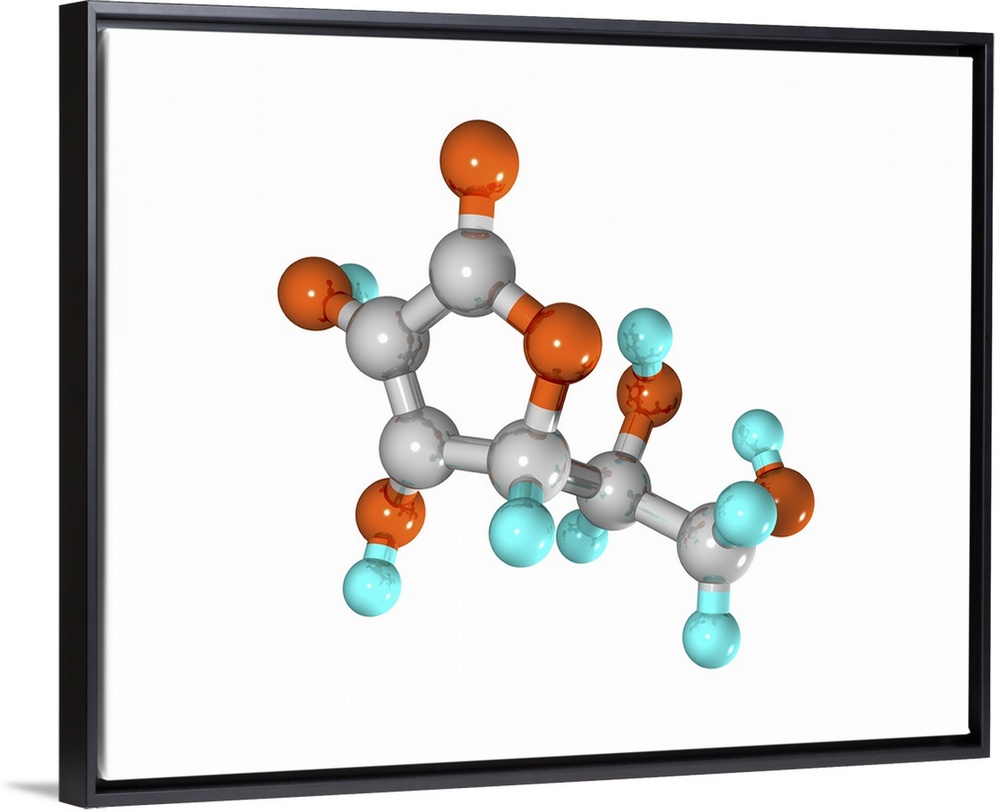 <p>Vitamin C. Computer model of a molecule of the water-soluble trace nutrient vitamin C. It is also known as ascorbic acid. This vitamin is mostly obtained from fresh fruit. The molecule's chemical formula is C6.H8.O6. Atoms (spheres) are colour- coded: carbon (grey), hydrogen (light blue), oxygen (orange).</p>