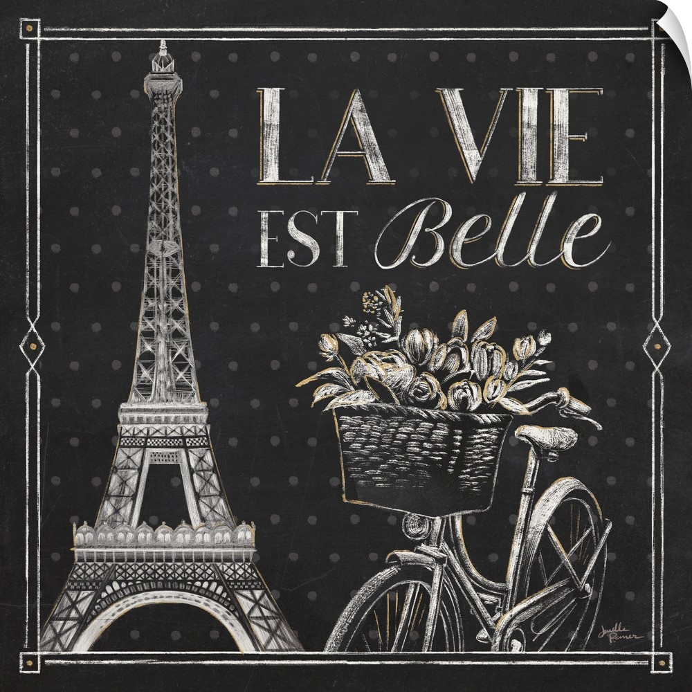 <p>Square chalkboard sketch with the phrase "La Vie Est Belle" and an illustration of the Eiffel Tower and a bicycle with flowers in the basket, all with gold highlights.</p>