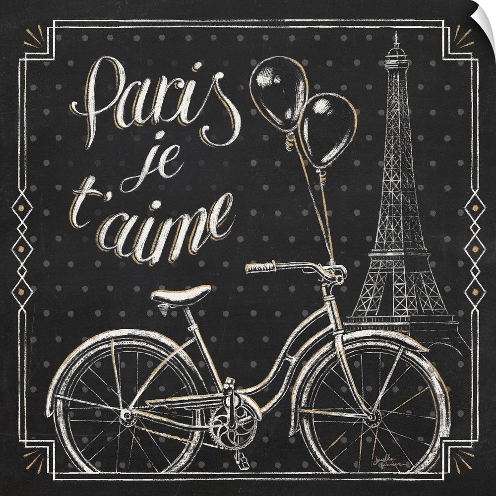 <p>Square chalkboard sketch with the phrase "Paris Je T'aime" and an illustration of the Eiffel Tower and a bicycle with balloons tied to it, all with gold highlights.</p>