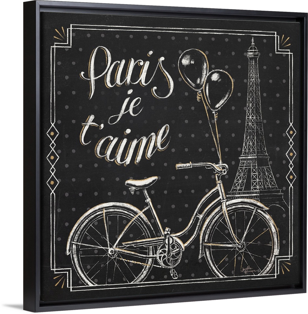 <p>Square chalkboard sketch with the phrase "Paris Je T'aime" and an illustration of the Eiffel Tower and a bicycle with balloons tied to it, all with gold highlights.</p>