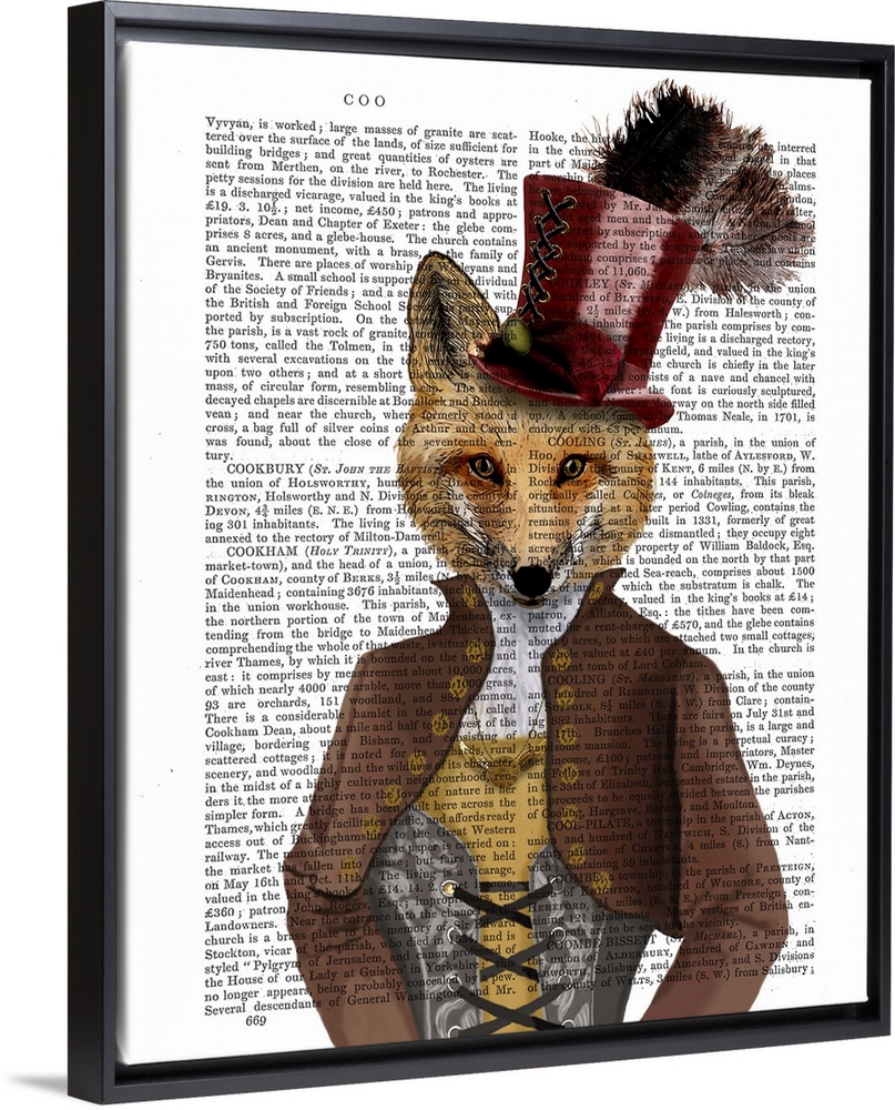 <p>Portrait of a fox dressed in Victorian clothes painted over a vintage dictionary page.</p>