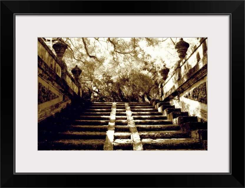 <p>This vintage style photograph is taken looking up a flight of stone steps that are outside underneath a large tree whose leaves have fallen to the ground.</p>