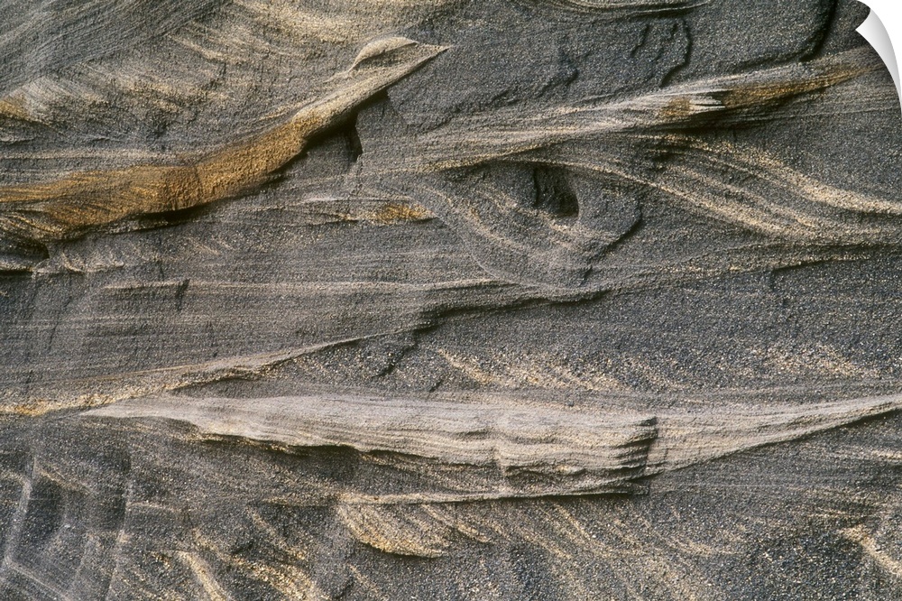<p>Volcanic ash layers in rock. Cross-bedded layers of volcanic ash laid down during countless eruptions over thousands of years. The volcanoes that laid down this ash are part of the Cascade Mountain Range. Studying the ash layers can help date the rocks and the eruptions, and help uncover the ancient history of the area. Photographed in the Columbia River Gorge, Washington State, USA.</p>