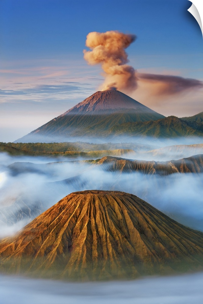<p>Volcanic landscape with Semeru, Batok. Indonesia, Java, Tengger Caldera, from Mount Pananjakan. Sunda Arc, Bromo-Tengger-Semeru National Park. Java, Asia, Indonesia.</p>