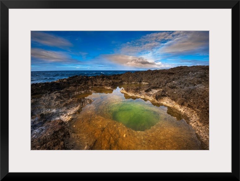 <p>Volcanic rock formations and sunlight reflecting in the green tidal pool on the beach at Pointe des Chateaux, Grande-Terre, Guadeloupe, French West Indies</p>