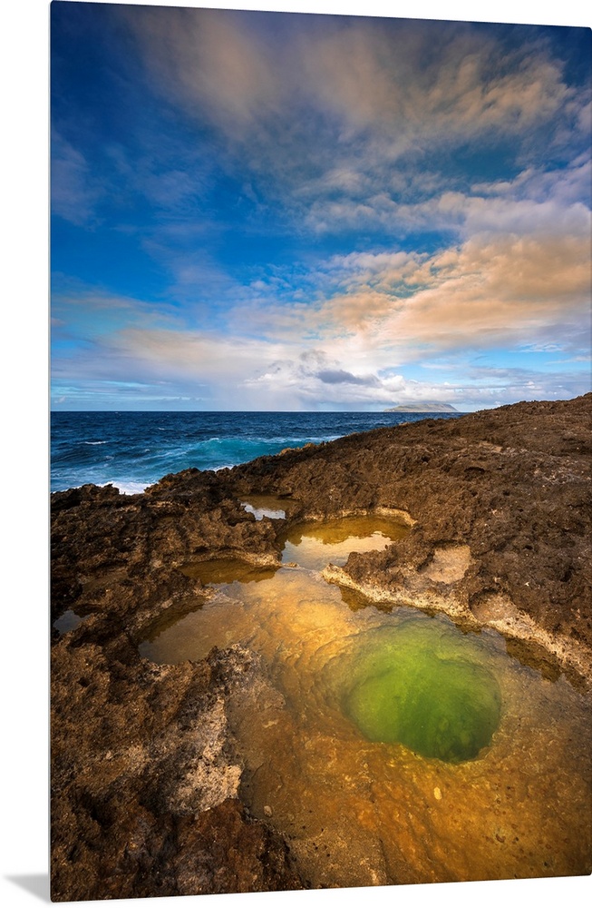 <p>Volcanic rock formations and sunlight reflecting in the green tidal pool on the beach at Pointe des Chateaux, Grande-Terre, Guadeloupe, French West Indies</p>