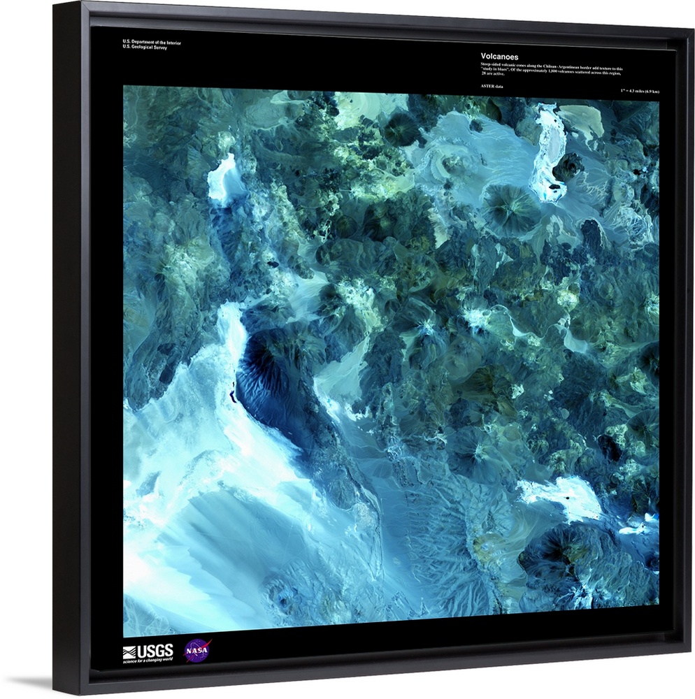 <p>Steep-sided volcanic cones along the Chilean-Argentinean border add texture to this study in blues. Of approximately 1,800 volcanoes scattered across this region, 28 are active. February 1, 2002.</p>