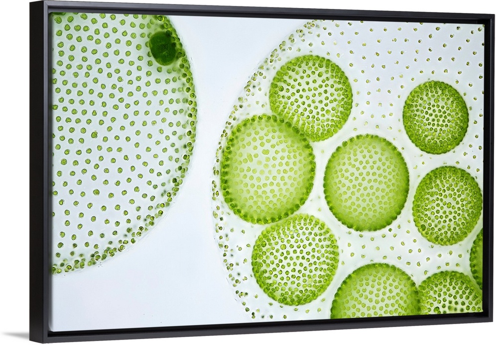 <p>Volvox colony. Light micrograph of a colony of the freshwater green alga Volvox sp. The colony is a hollow sphere made up from thousands of cells connected by cytoplasmic threads and arranged in a single layer. Each cell has two flagella, which point outwards, and are used for locomotion. The green spheres within the colony are daughter colonies, which are produced asexually.</p>