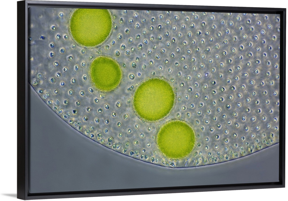 <p>Volvox colony. Light micrograph of a colony of the freshwater alga Volvox sp. The colony is a hollow sphere made up from thousands of cells connected by cytoplasmic threads and arranged in a single layer. Each cell has two flagella, which point outwards, and are used for locomotion. The green spheres within the colony are daughter colonies, which are produced asexually. Magnification: x280 when printed at 10 centimetres wide.</p>