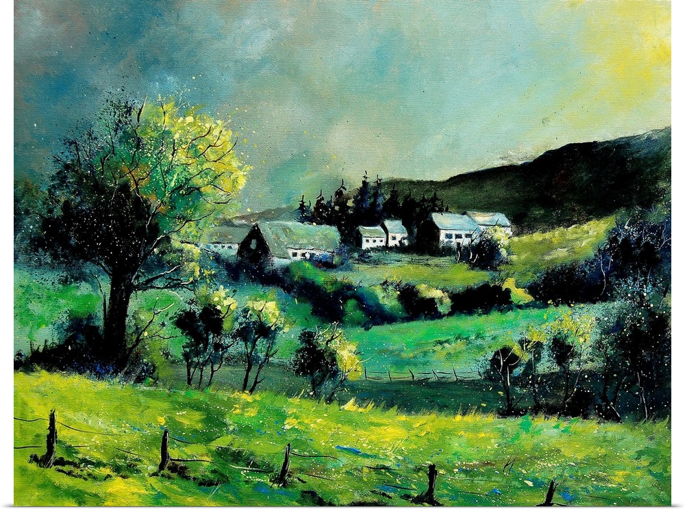 <p>Horizontal painting of a spring landscape with rolling fields in the foreground and a Belgium village in the background.</p>