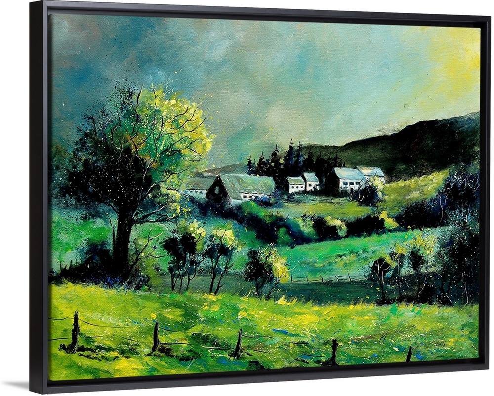 <p>Horizontal painting of a spring landscape with rolling fields in the foreground and a Belgium village in the background.</p>
