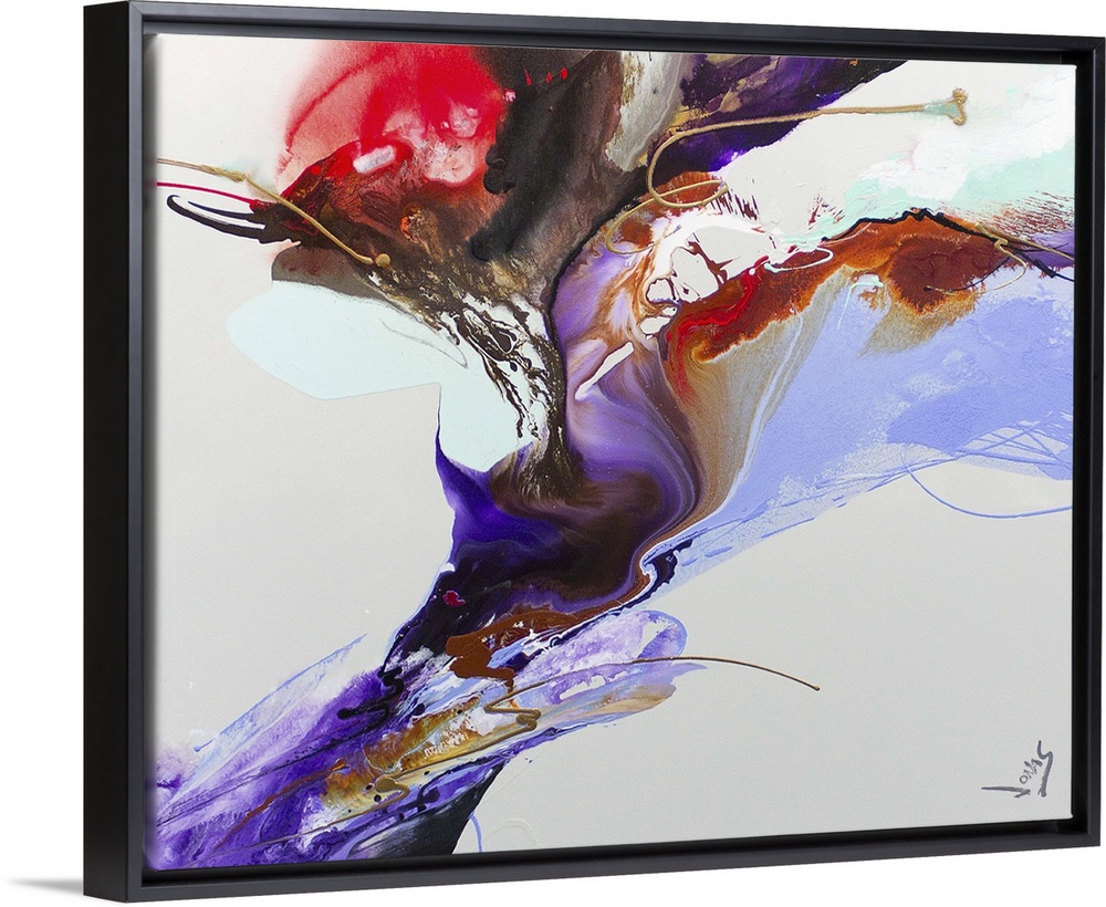 <p>A contemporary abstract painting using purple and red tones in motion of fluidity against a light gray background.</p>