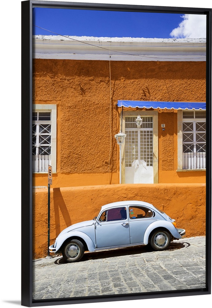 <p>Photograph of a classic Volkswagen Beetle in front of an orange and blue building. From the Viva Mexico Collection.</p>