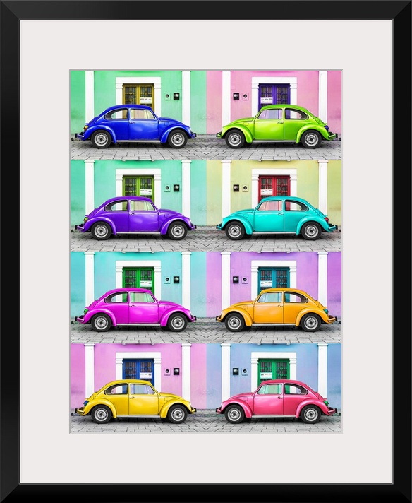 <p>Octaptych photograph of different brightly colored classic Volkswagen Beetles in front of vibrant buildings and doors. From the Viva Mexico Collection.</p>