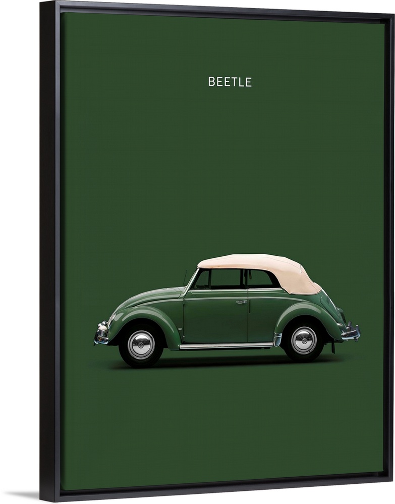 <p>Photograph of a dark green VW Beetle Green 53 with a cream hood printed on a green background</p>