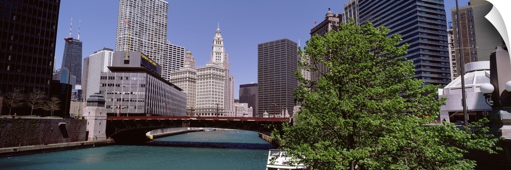 <p>Panoramic photograph of overpass with lake below and city buildings and skyscrapers in the background under a clear sky.</p>