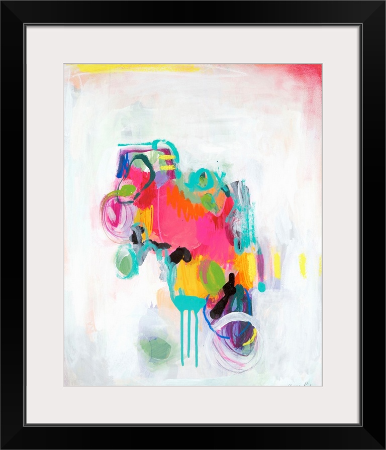 <p>Abstract mixed media artwork with vivid pink, teal, and yellow color on white.</p>