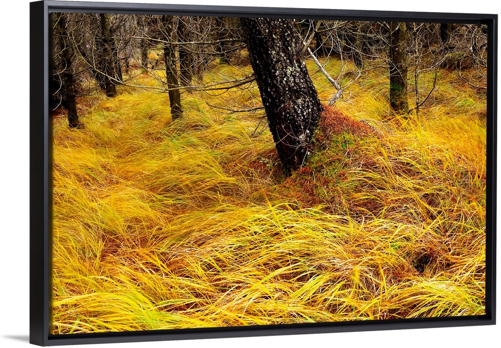 <p>A forest floor covered in yellow grass.</p>