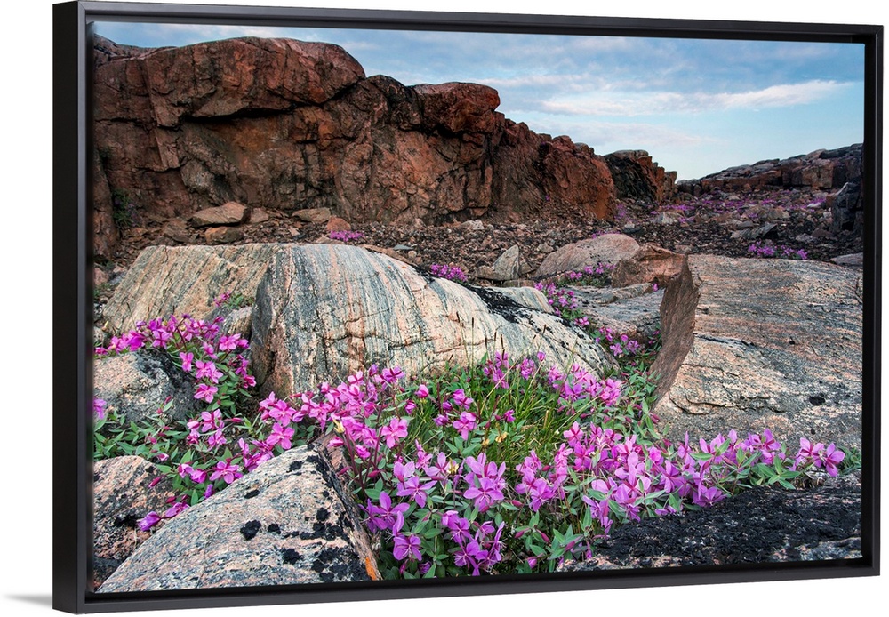 <p>Canada, Nunavut Territory, Ukkusiksalik National Park, Dward Fireweed (Chamerion latifolium) amid rocky arctic landscape along Wager Bay</p>