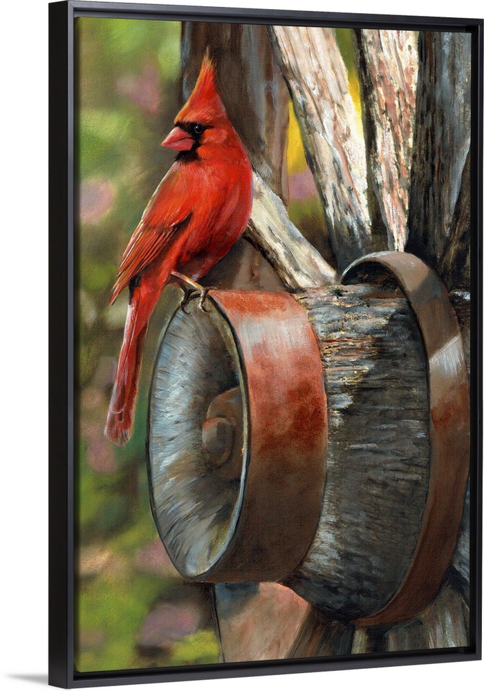 <p>A bright red cardinal sitting on the edge of a wagon wheel.</p>