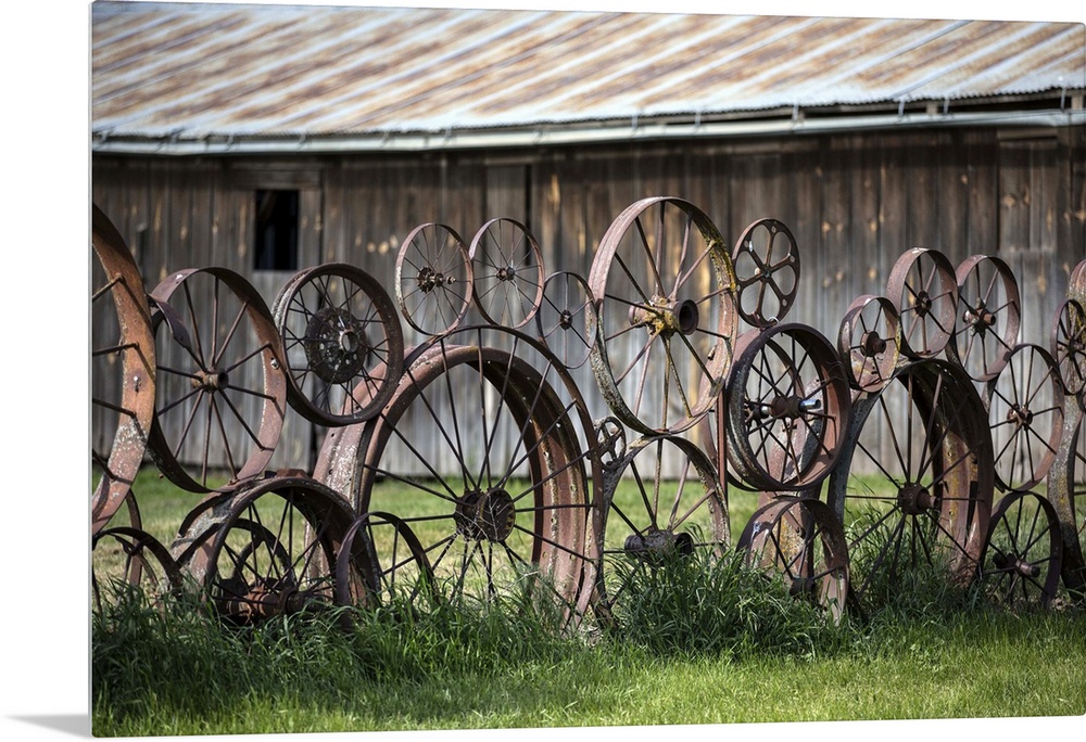 <p>Wagon wheels and barn in the Palouse</p>