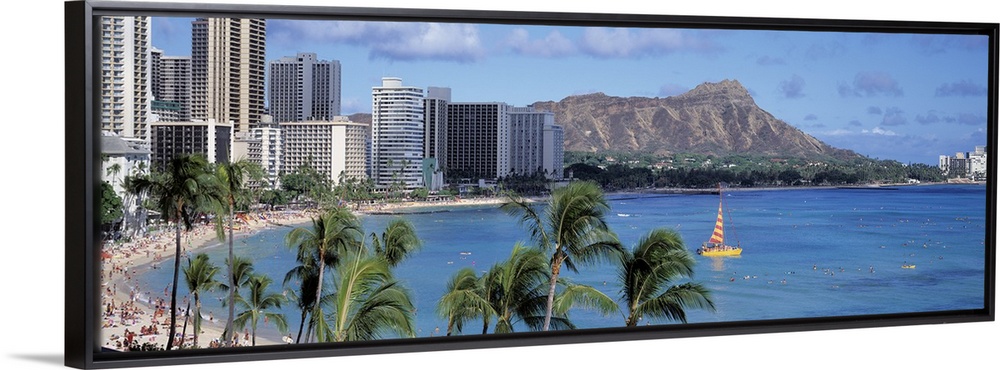 <p>Large, panoramic photograph of tall buildings along the coast of Waikiki Beach in Honolulu, Hawaii.</p>