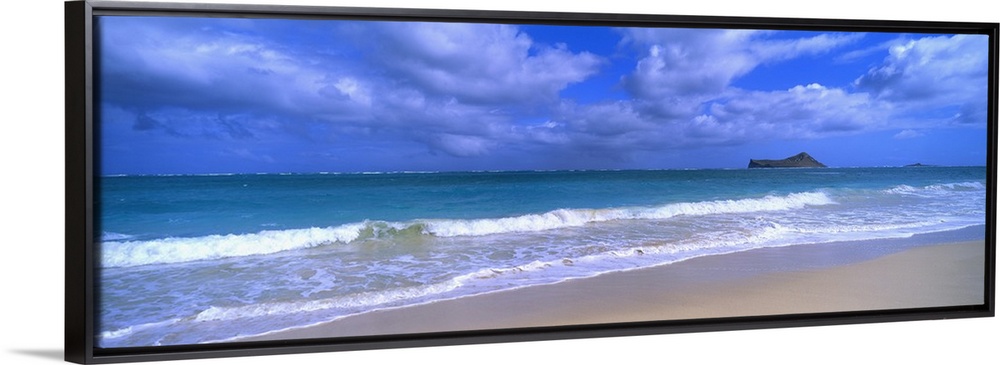 <p>Panoramic photograph of waves breaking on the beach during a cloudy day with island in the distance .</p>