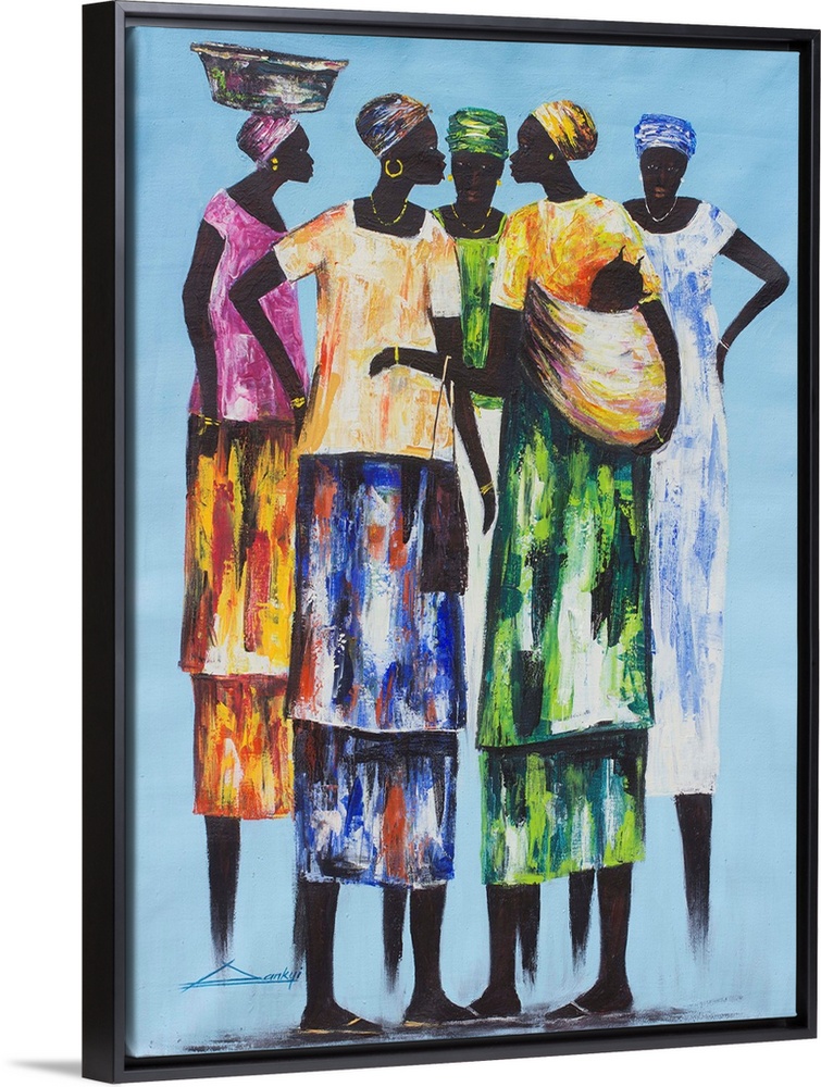<p>Colorfully dressed in traditional attire, five women enjoy a spirited chat. They take time out of their busy day, for friendship is important to them. Bright Dankyi Mensah depicts the group in brilliant hues, detailing the basket one carries and the baby peeking out of a shawl.</p>