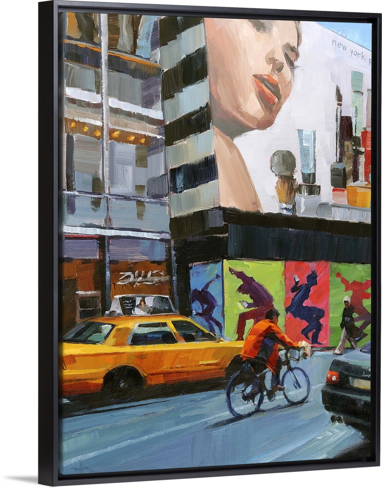 <p>Contemporary painting of a person riding a bicycle through the city.</p>