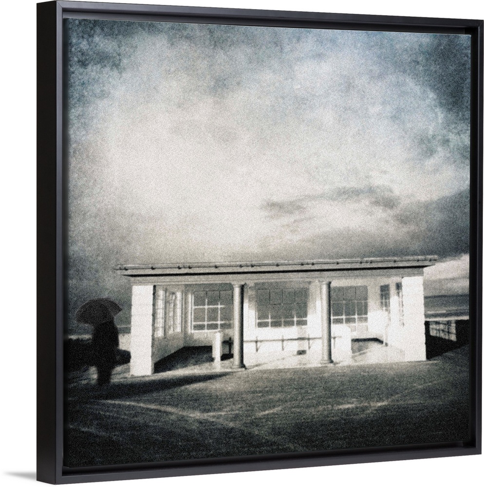 <p>A surrealist vintage image of a small English seaside seafront shelter in white with a man holding a black umbrella.</p>