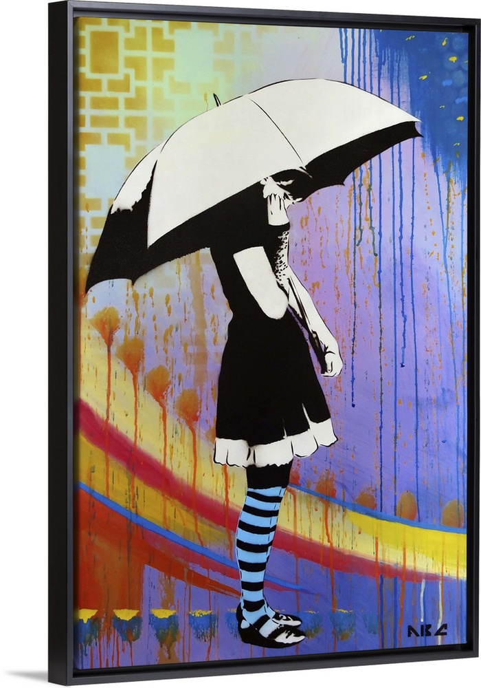 <p>Urban painting of a woman holding a white umbrella.</p>